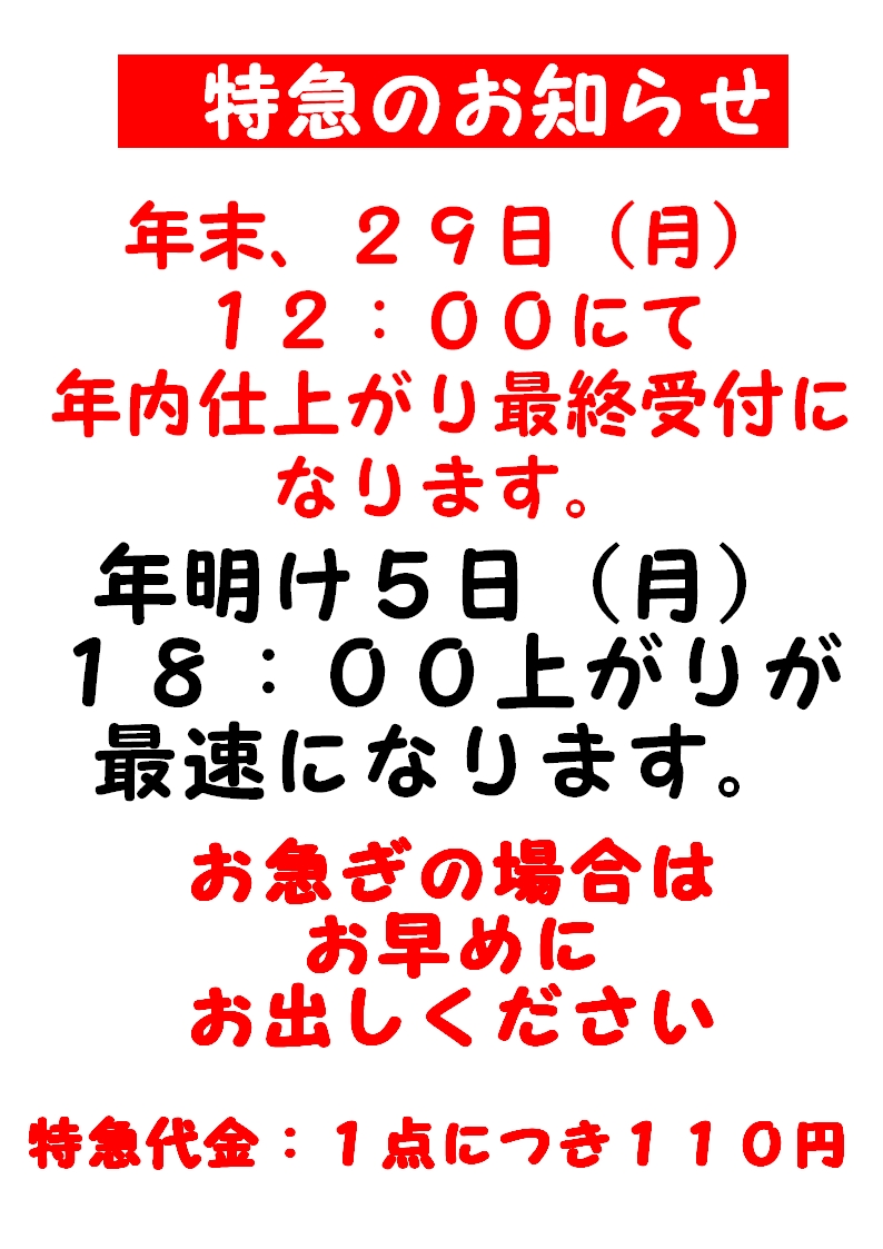 « 年末年始の特急扱い 12月30日の営業時間のお知らせ »
